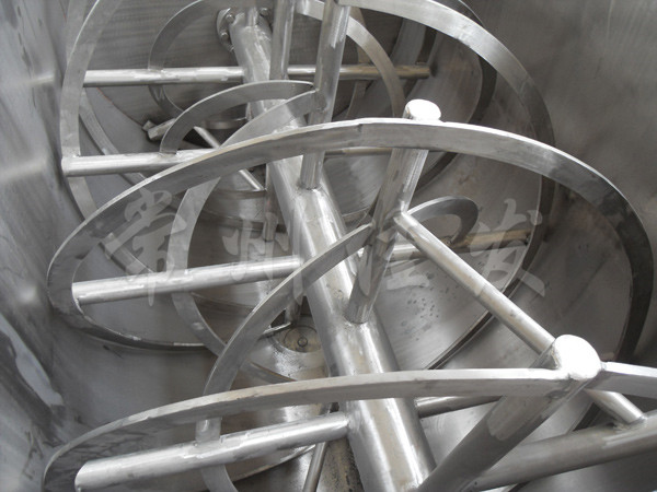該機(jī)型由容器 螺旋攪拌葉片和傳動(dòng)部件組成,螺旋葉片一般做成雙層或三層,外層螺旋將物料從兩側(cè)向中央?yún)R集,內(nèi)層螺旋將物料從中央向兩側(cè)輸送,形成對(duì)流混合。容積可做成圓形,以便夾套及于反應(yīng)干燥。